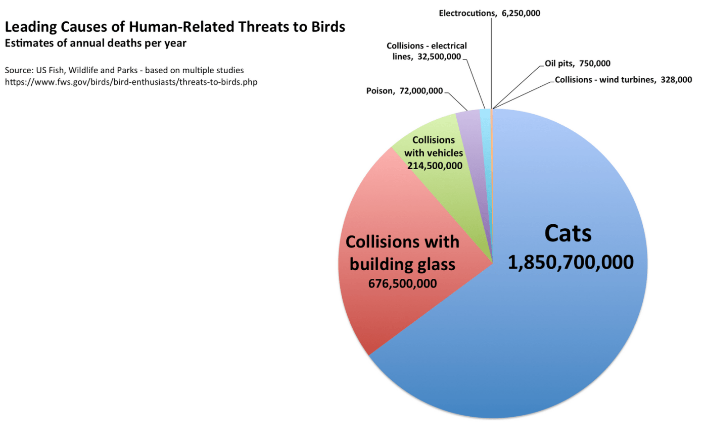 Of course all human causes of bird deaths matter. Each year, skyscraper window strikes kill almost 600 million birds. Vehicle collisions kill almost 200 million birds. Millions more birds are killed by power lines, pollution, pesticides and other poisoning. Tens of thousands are killed by residential window strikes and wind turbines.