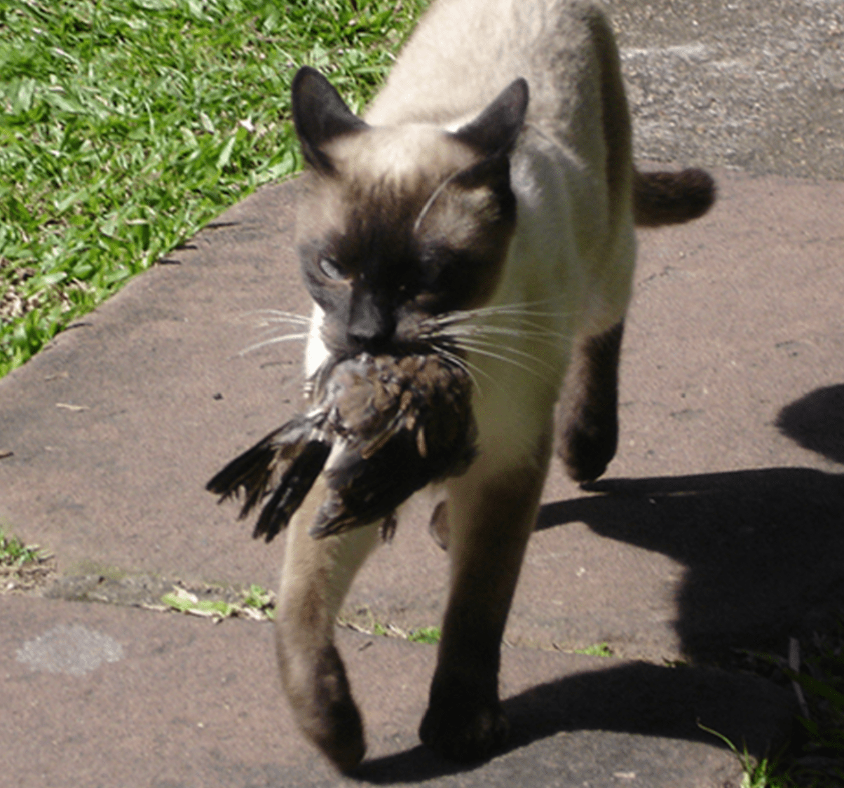 A study of urban cat predation in the city of Dunedin, New Zealand, estimated the total catch for six bird species at close to the total population of those birds in the city, and said that statistical modelling “indicated low likelihood of population persistence with cat predation.” In other words, those bird species appear headed to be for extinction in that city, as a direct result of cats.