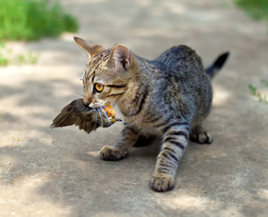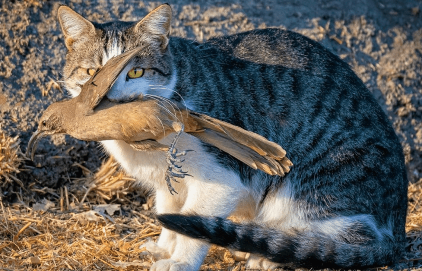 Researchers in California compared a state park with 25 cats to a state park with no cats. They found that the park with cats had only half as many birds as the park with no cats, and that in the park with cats, some species, like the California Quail and California Thrasher, were completely wiped out.