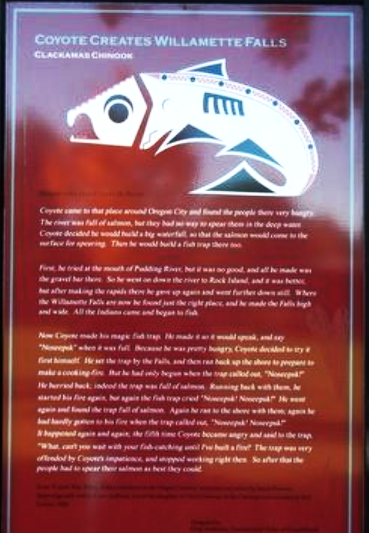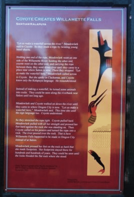 The Santiam Kalapuya, south of Willamette Falls, have their own legend about Coyote creating the Willamette Falls – in this case, in collaboration with Meadowlark. This story was published in Indian Legends of the Pacific Northwest by Ella E. Clark in 1953. Both the Clackamas and Santiam stories are recounted by historical markers near Willamette Falls.